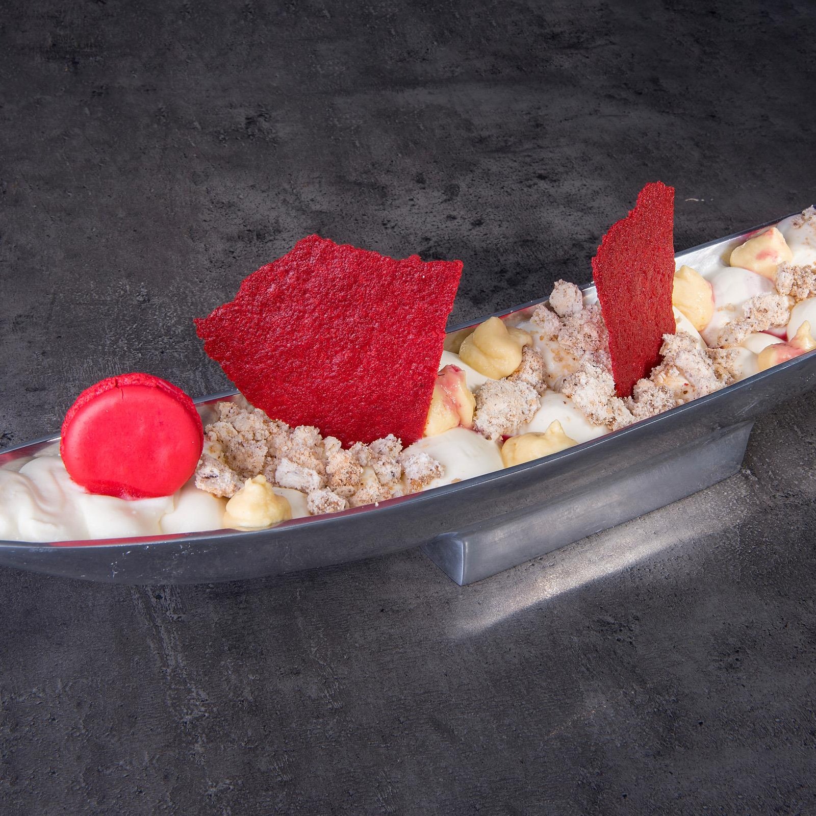 בתפריט הקינוחים תמצאו את המנה הזוגית והחדשה - סירה של קרמבל עוגת גבינה ומרנג מפורר, שמגיעה עם קרם מנגו וקרם מסקרפונה, בליווי פרי העונה תותים טריים ופירות יער, ומקרון תות לקישוט. (69 ₪) - מושלם!