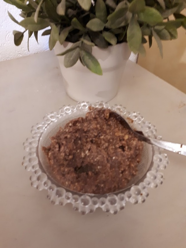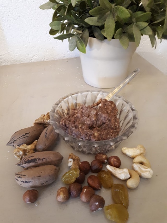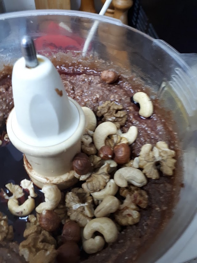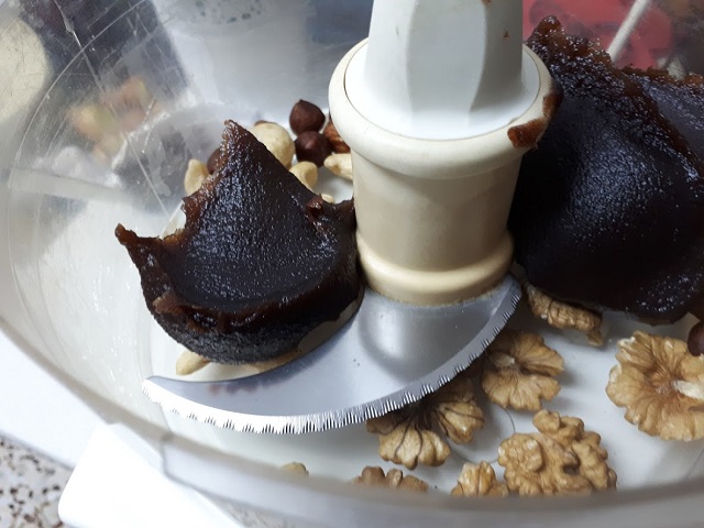 מכניסים את מחצית מכמות כל האגוזים לקערה של מעבד מזון עם הדבש, ממרח התמרים והתפוח (כולל הקליפה לא כולל הליבה כמובן) ומעבדים לממרח חלק.