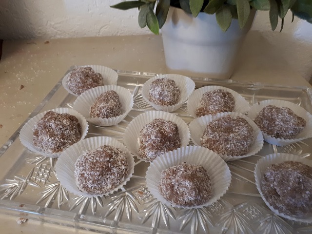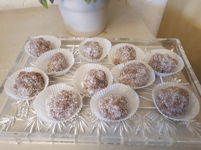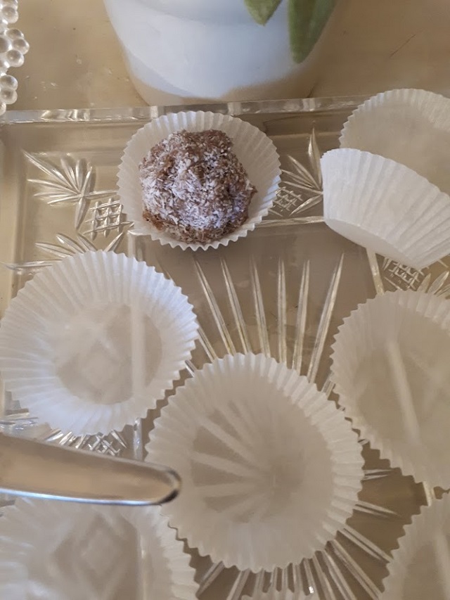 הצעת הגשה: אחרי שהחרוסת מתקררת מעט, ניתן ליצור ממנה עיגולים (כמו כדורי שוקולד) ולגלגל בקוקוס טחון.