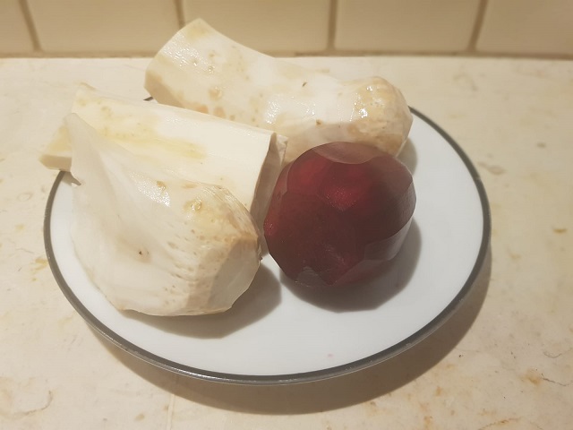קולפים שורש חזרת גדול ומשרים במים. קולפים סלק קטן ומשרים במים (גודל הסלק וכמות שורש החזרת יקבעו עד כמה החזרת שלכם תהיה חריפה, אם אתם רוצים פחות חריף תוסיפו עוד קצת סלק. אורן ממליץ על המינון הזה).