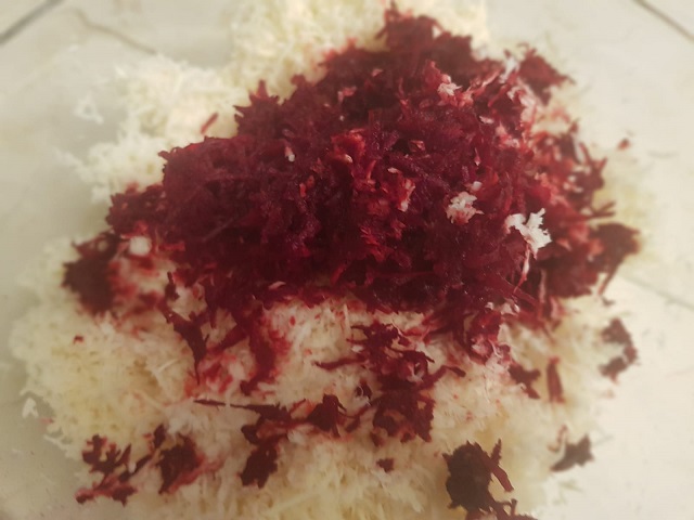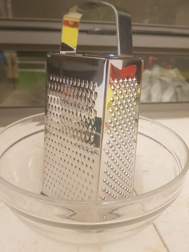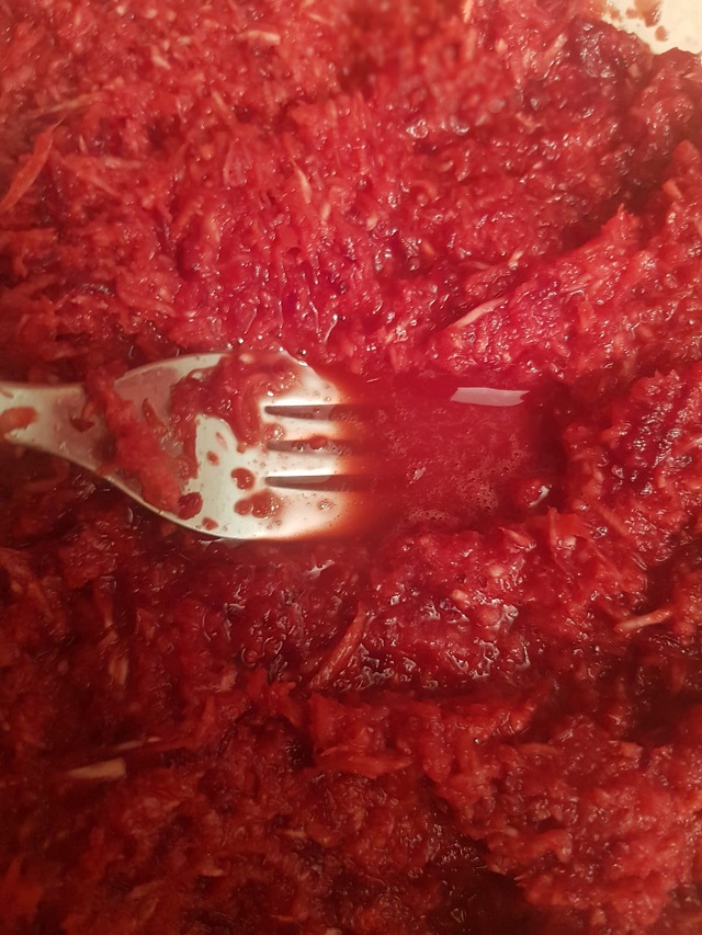 כשהמאוורר בגב שלכם גרדו את הסלק (הלא מבושל) ואת שורש החזרת על הצד הדק של הפומפייה.